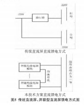 传统直流屏控母和合母由于电压不一致,负载要严格区分,比如 ,微机保护.指示灯等必须接入控母,断路器分合闸、储能电机等负载必须接人合母。本文所阐述的技术控母和合母的电压等级一致,并联输出,可互用,方便用户的使用。传统直流屏、并联型直流屏馈电方式,如图5所示。