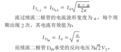 加了续流二极管后其输出电压波形V3与不加续流二极管时相同。原先流经桥臂上元件的续流电流变成通过二极管续流。各原件中流过的电流波形和变压器副边电流波形明显有一定的间隔。每个周期中流过晶闸管T1、T2、D8、D9的电流波形宽度都是π—α,其电流有效值为(Id为负载电流)