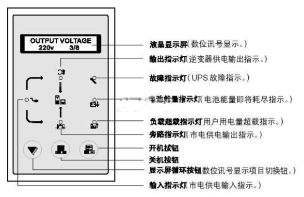 (2按一下关机按键后,可将ups逆变器关机,改由市电旁路供电。此键主要作为ups日常开关机使用。