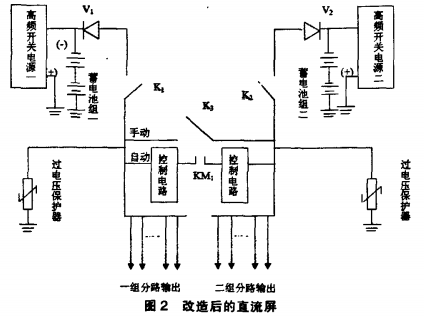 改进后的直流屏添加刀闸K1、K2、K3,两个阻隔二极管V1、V2,直流接触器KM,及操控回路。这样能更好地操控电源的输人切换,便于保护。