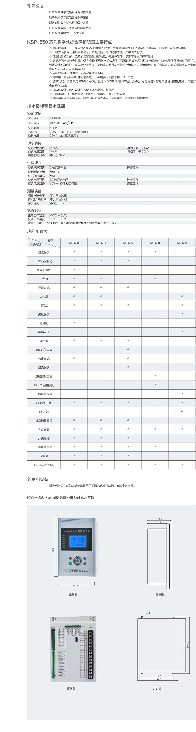 KSP-650 系列数字式保护装置,是我公司最新推出的一款实用型综 合保护装置。装置功能齐全,运行稳定,采用通用型一体化设计理 念,具备保护、测量、控制、通讯完备的功能,广泛适用于 35kV 及 以下电压等级变配电站、开闭所等场合。新颖的结构设计,外观时尚, 结构精巧,既适用于安装在中置柜内,也可方便安装于柜体体积狭 小的环网柜等各种柜体。