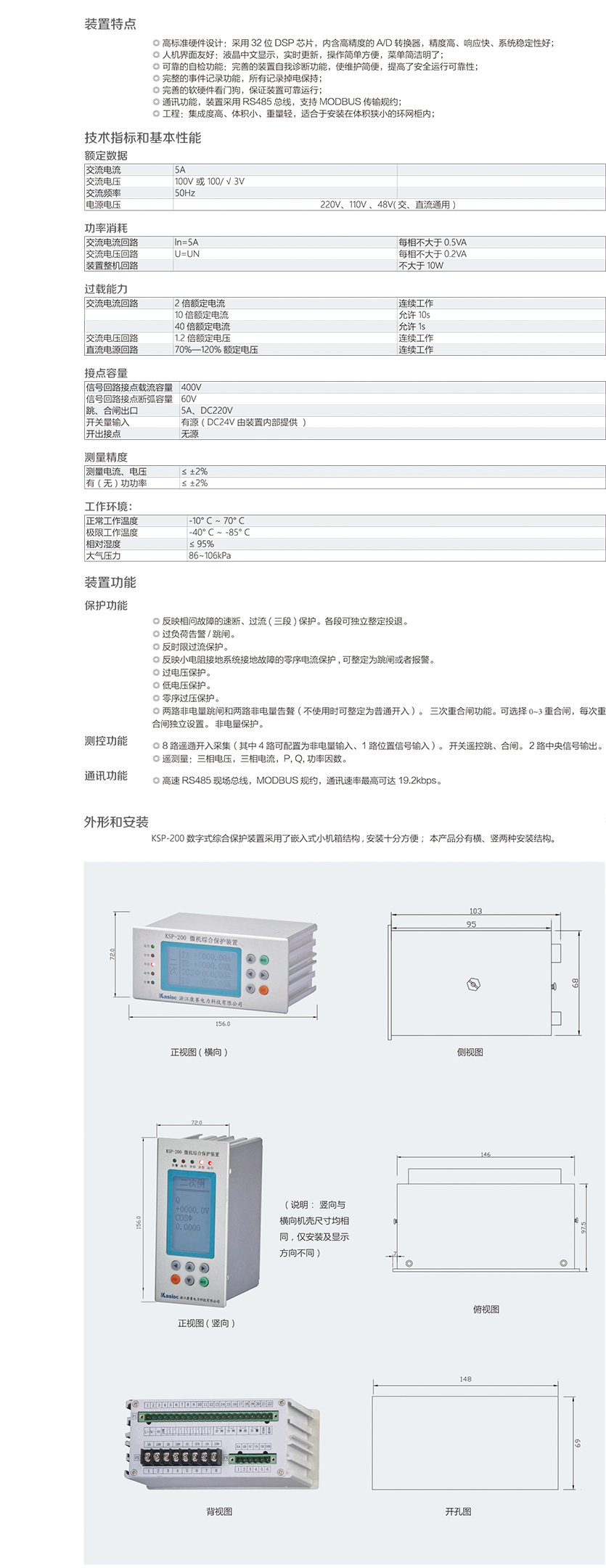 KSP-200 数字式综合保护装置是我公司为适应我国电气成套事业发 展的需要,积累多年电力自动化产品开发经验,运用新技术、新工 艺而推出的一款经济性综合保护装置。装置结构设计紧凑、体积小巧, 交直流电源通用,可满足 10KV 及以下电压等级进出线、厂用变等保 护测控功能。装置适宜于安装在体积狭小的环网柜内,构成智能化 环网柜。
